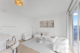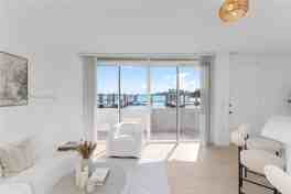 Available fully furnished and move in ready, this renovated bayfront residence at Palm Bay Condo combines Units 1G and 1H to create an oversized one bedroom, two bathroom home with bright south facing interiors and open views of the marina and Biscayne Bay.