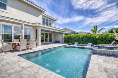 This fully furnished 2023 GL Home in Arden is one of a kind, a spacious 5 bedroom, 4.5 bath residence with a loft and den, offering both luxury and versatility. This home features a private pool and hot tub, and a rare first-floor bedroom with a full bath, closet, and private entrance, ideal for guests, multi-generational living, or a private office. The open-concept design showcases a gourmet kitchen complete with a built-in gas range, dual ovens, and a large island overlooking the backyard oasis. Upstairs, luxury vinyl plank flooring runs throughout, including the expansive primary suite with pool views and a spa-like bathroom with both a tub and separate shower. Enjoy indoor-outdoor living with the screened-in lanai and retractable electric screen, while the heated saltwater pool wit