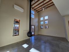 The main living area is bright and open, highlighted by a suspended orb fireplace that serves as both a focal point and functional feature. Tall ceilings and custom finishes create a sense of space, while the layout allows for separation and privacy between bedrooms.