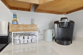 Fully stocked kitchen with stainless steel appliances, coffee maker and basic cooking necessities
