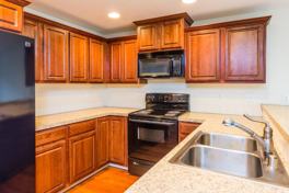 Kitchen with cherry colored cabinets, sleek black kitchen appliances included, breakfast bar and dining room with sliding glass door to fenced back yard and private patio.