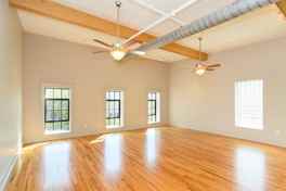 Modern and bright in the heart of downtown Asheville! This third floor walk-up apartment has a spacious great room with high, wood-beamed ceilings and east-facing windows overlooking Biltmore Ave. Beautiful oak floors are throughout. The open kitchen includes solid surface countertops, shaker-style cabinets, and stainless appliances including the electric range, built-in microwave, refrigerator, and dishwasher.