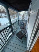 The freshly painted entry way takes you up the stairs to a storage landing perfect for winter fun or ski gear, with a private balcony. You then enter the living room with a large flat screen TV and recliners, and move though to the dinning room which can sit 6-8 people. At the heart of the apartment is the beautiful dine-in kitchen which has full size appliances and granite counters ideal for a chef. Of the 3 bed rooms, 2 have queen beds and moderate-large size closet space, and the 3rd has a twin size bed perfect for those who enjoy sleeping alone. The washer & dryer are next to the bathroom-streamlining laundry! Finally, enjoy the peaceful breeze and sunset on the back porch overlooking the small park on the block, as well as a view of the city.
