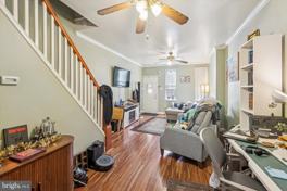 Nestled on a secluded, charming brick street in the heart of Port Richmond, this 2-bedroom, 1.5-bathroom gem perfectly blends classic character with modern upgrades. The inviting exterior features a rare breezeway providing direct access to the back yard, while the interior welcomes you with a spacious, open-concept living and dining area. This bright main level is adorned with hardwood floors, fresh paint, elegant crown molding, and dual ceiling fans, all kept perfectly chilled by a high-efficiency ductless mini-split AC system. The heart of the home is the expansive, updated kitchen, which boasts granite countertops, stainless steel appliances, and rich wooden cabinetry. From here, you can step directly out to the rear patio, making it an ideal setup for indoor-outdoor entertaining. Upstairs, the home's layout has been thoughtfully reconfigured from its original three-bedroom footprint to prioritize comfort and luxury. The result is an oversized hall bathroom and two generously sized, carpeted bedrooms. The primary suite is a true retreat, featuring a massive walk-in closet-a rare find for the neighborhood. Every room is equipped with ceiling fans to ensure year-round comfort in this meticulously maintained residence.