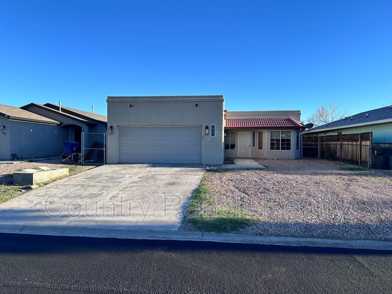 This well-maintained home is centrally located in Bullhead City, just minutes from the Colorado River, offering both convenience and comfort. The property features 3 bedrooms and 2 bathrooms with approximately 1,393 square feet of living space, originally built in 1992 and enhanced with numerous upgrades over the years. The interior showcases travertine flooring throughout the main living areas, with carpeted bedrooms for added comfort. The spacious kitchen is equipped with a tile backsplash, pantry, and ample cabinetry, and opens to a casual dining area, making it ideal for everyday living. The living room is highlighted by bay windows that bring in natural light. All bedrooms are generously sized. The primary suite includes a walk-in closet and an upgraded bathroom with a tile walk-in shower. Guest bedroom two features French doors and direct access to the garage, offering flexible use as a bedroom, office, or bonus space. Additional features include a finished two-car garage with laundry hookups, an 11' x 40' enclosed rear patio with ceiling fans, plus an additional covered patio for outdoor enjoyment. The fully fenced backyard with chain-link fencing, low-maintenance landscaping, and mountain views from the front complete this attractive property.