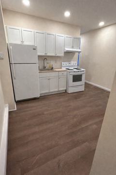 This recently renovated apartment features a bright, modern interior with updated flooring throughout, fresh neutral paint, recessed lighting, and a clean, open layout. The kitchen offers white cabinetry, a full-size refrigerator, range with hood, and ample counter space, flowing nicely into the living area accented by a ceiling fan and natural light. The bathroom has been refreshed with a tiled tub surround, modern vanity, and updated fixtures. Bedrooms are well-sized with good closet space, and the overall layout provides a comfortable, functional feel. A shared laundry room is available on-site; washer and dryer are not included in the unit, and tenants must supply their own. This move-in-ready apartment offers a stylish, low-maintenance living option in a newly updated setting.