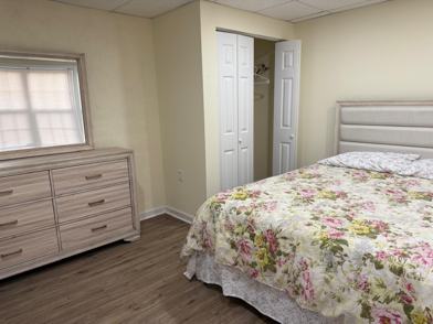 Furnished 1 bedroom with queen bed, linens, and closet