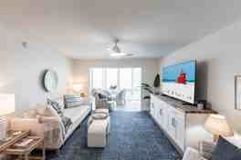 Step into the spacious living area, where natural light floods through large windows, illuminating the stylish furnishings and inviting ambiance. The open-concept layout seamlessly connects the living, dining, and fully equipped kitchen areas, creating an ideal space for entertaining or unwinding after a day of beachside adventures.