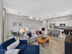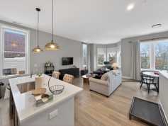Step into an inviting living space featuring beautiful bay windows that fill the home with natural light. The open-concept living and dining area flows seamlessly into a modern chef’s kitchen, complete with tall soft-close cabinetry, brass hardware, contemporary lighting, and sleek stainless steel appliances. A dishwasher, microwave, and in-unit front-loading washer and dryer add everyday convenience.