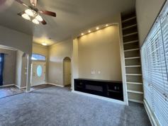 Additional features include a built-in storm shelter, a large screened-in patio, and a dedicated laundry room with utility sink. Laundry space is designed for a stacked washer and dryer (tenant-provided).