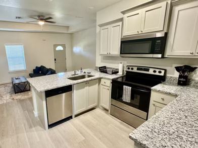 Step into a bright, open-concept living space featuring luxury vinyl plank flooring and stylish furnishings throughout. The modern kitchen is fully equipped with granite countertops, stainless steel appliances, and a breakfast bar, perfect for home-cooked meals or casual dining. For your convenience, the home includes a washer, dryer, refrigerator, microwave, dishwasher, and all essential kitchenware.
