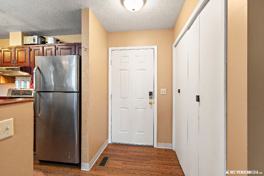 Updated top floor unit with 835 sq feet of open concept living. New flooring July 2025 except for the bedrooms. New bathroom vanity, mirror & lighting just installed! 2 bedrooms, 1 with a walk-in closet. 1 assigned parking spot with head-bolt heater plug in. Large utility room and a new washer/dryer just installed. Very quiet complex, bus stop out front, and walking distance to stores and restaurants. Private covered deck off the living room.
