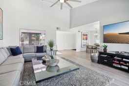 The open-concept interior features vaulted ceilings, abundant natural light, and wood-look laminate flooring throughout. The custom kitchen is fully upgraded with quartz countertops, glass tile backsplash, stainless steel appliances, gas range, and a countertop bar, perfect for entertaining or casual dining. Dual-pane sliding doors, recessed lighting, and contemporary furnishings complete the space.