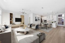 The open-concept first floor is ideal for both everyday living and entertaining, showcasing a chef’s kitchen with an oversized island, premium finishes, ample cabinetry, and seamless flow into the dining and living areas. Natural light fills the home, highlighting the modern design and upscale craftsmanship throughout.
