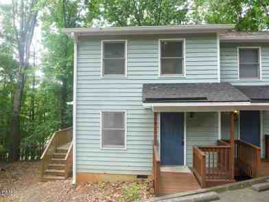 This duplex style townhome is in the Whispering Hills neighborhood in Carrboro. This location is convenient to Carrboro, UNC and Highway 54. The traditional floor plan includes the combined living-dining space and kitchen on the main level, with the bedrooms on the second level. The home features wood look plank flooring on the main level. There is a ceiling fan in the living room. The living space leads out to a deck on the back side of the home. There is a storage closet on the deck. The dining space is convenient to the kitchen. This space has a glass slider to a small side porch. The kitchen features updated counters and white cabinets. A refrigerator, range, and dishwasher are included. The laundry closet is in the living area, with washer and dryer hook-ups. There is a half bathroom on the main level. The bedrooms both have carpet and double door closets. The jack and Jill style full bathroom has a dual sink vanity and a tub-shower. $15/mo filter fee.