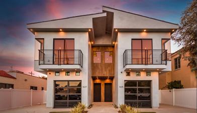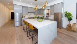 Property features include a custom chef’s kitchen with dual sinks, quartz countertops, premium appliances, center island, and Fleetwood sliding doors leading to a private backyard. Rooftop deck with dual entertaining spaces, outdoor kitchen, and TV hookups.