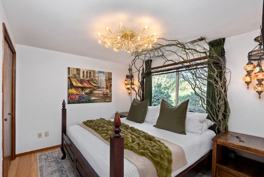 The Enchanted Bedroom: Sleep beneath a dramatic canopy of twisted branches and vines, illuminated by a crystal chandelier and the warm amber glow of hanging Moroccan mosaic lamps. The plush bedding and moss-green accents make it feel like a royal chamber in the Spring Court.