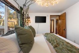 The Outdoor Oasis Through the glass doors lies your private balcony overlooking a lush, green yard. The highlight of your stay will undoubtedly be the private hot tub—perfect for soaking under the stars after a day of adventuring.