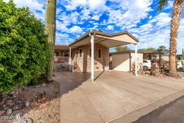 This park model is located in a great Adult community. The home features covered car port and a spacious patio. Living room offers space for a couple chairs or small couch, dining area with a hutch, The kitchen is equipped with a gas stove, microwave, dishwasher and brand new refrigerator. Beautiful vinyl plank flooring in living room dining room and kitchen. Carpet in bedroom and vinyl in bathroom. Sun screens on window that face the west. Lovely side patio and area to make a very nice little oasis in the back yard that backs up to the wash. The shed houses the washer and dryer and still has room to store a golf cart if needed. Happy Trails is a wonderful 55 plus community with a golf course, bar and restaurant, pool, Tennis and pickle ball courts. A new car wash and weekly events.