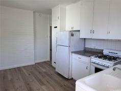 Ground-floor corner unit in a 5-unit building with open parking directly in front. Features vinyl plank flooring, fresh interior paint, ceiling fans, and jalousie windows for natural light and ventilation. Kitchen includes refrigerator, gas range, ample cabinetry, and utility sink, with potential space for washer installation. Bathroom features an updated shower/tub enclosure.