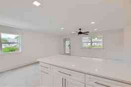 Fully renovated ground-floor corner 1 bed, 1.5 bath condo in the luxurious Kings Point community. Open-concept layout with smooth ceilings (no popcorn), new LED lighting, and ceiling fans throughout. Updated kitchen with stainless steel appliances, white shaker cabinets, and quartz countertops. Renovated bathrooms with new vanities; primary bath features a walk-in tiled shower with glass door and walk-in closet with custom wood shelving. Upgrades include new electrical panel, new plumbing, and tankless water heater. Enclosed patio with impact windows, A/C, and full-size washer and dryer. Conveniently located near the Flanders main entrance and clubhouse. Kings Point offers golf, pools, tennis, fitness center, theater, café, and bistro.
