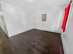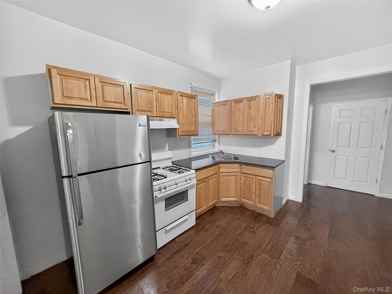 Bright two bedroom apartment featuring dark wood style flooring and freshly painted throughout. Spacious living area with natural light. Kitchen includes wood cabinets, dark countertops, stainless steel refrigerator, and gas stove. Two well sized bedrooms with baseboard heating and windows. Clean bathroom with vanity storage and tiled flooring. Convenient layout and move in ready. 1st floor unit,