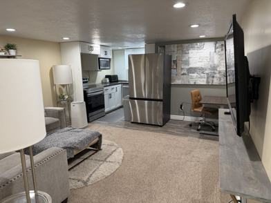 Gorgeous, spacious in-law apartment with high ceilings and standard size windows. Well-lit, 10 minutes from downtown and includes a nice yard with incredible views of the mountains and valley! It is furnished with a queen size bed, kitchen, a comfortable couch, and a TV mounted on wall. Newly built bathroom with brand new washer and dryer. Includes utilities with 1200 Mbps download speed internet.