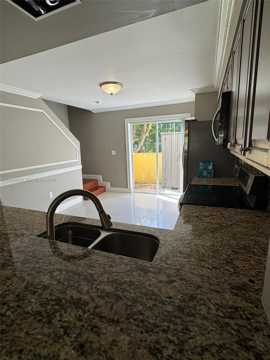 open floor plan with crown molding, an updated kitchen with stainless steel appliances, granite countertops, a chic