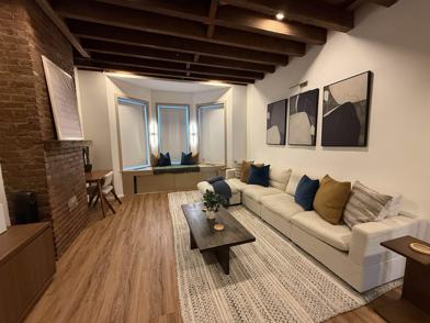 Welcome to this stunning luxury rental at 414 41st Street in Union City, offering a perfect blend of modern design and comfort. This beautifully appointed 2-bedroom, 1-bath residence features soaring cathedral ceilings with exposed beams, creating an airy and dramatic living space filled with natural light. The open-concept floor plan flows seamlessly into a sleek, modern kitchen complete with stainless steel appliances, ample cabinetry, and generous storage;ideal for both everyday living and entertaining. An adjacent sitting area, perfect for a dining space or home office, adds flexibility to the layout. The ample living room has an exposed brick wall, sitting area with storage at the bay window, and space of a work desk. Step outside to your private deck, which leads to a shared yard, offering a rare outdoor retreat in this vibrant neighborhood. The spa-like bathroom is thoughtfully designed and includes a washer and dryer for added convenience. This pet-friendly unit is ideally located just half a block from Bergenline Avenue and NYC transportation, with easy access to shopping, dining, cafes, and all that Union City has to offer. A truly special rental that combines luxury, location, and lifestyle—don’t miss it.