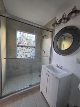Brand new shower with shower door and tile floor. Saltillo tile throughout the Carriage House. New Split AC system in Bedroom. Another newer Split AC system in the Living Rm. Newer Washer and Dryer and large garage and storage. Driveway parking on the right side for up to 2 vehicles.