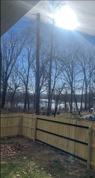 The property features a fenced backyard and a long paved driveway that provides convenient parking space. The home offers seasonal lake views — more prominent in winter when tree cover is minimal, with slight or partial views during the summer months.