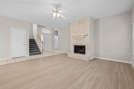 Beautiful stone 2 level townhome, exceptionally maintained with luxury vinyl plank & tile flooring throughout and fresh neutral paint. Unit has 3 beds/3 baths with wood/gas burning fireplace, 2 car garage and spacious, covered patio & private fenced backyard. 1 bed and bath down. Spacious primary suite with walk in closet and double vanity. Washer and dryer included and 2 AC systems/thermostats upstairs & downstairs. Enter through scenic courtyard or garage. RRISD, convenient to toll roads, shopping & major employers. North Forest neighborhood park, Springwoods pool & tennis courts conveniently located across street. Available for an immediate move in and pets welcome.