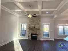The master bedroom includes a spacious bathroom with a separate shower and garden tub, along with a large walk-in closet for ample storage. Two bedrooms share a Jack-and-Jill bathroom with pocket doors. Laundry room also features pocket doors for added convenience. Third bedroom and full bathroom are in a separate area of the home, offering added privacy and flexibility. All bedrooms offer generous closet space. The living area includes an electric fireplace, creating a warm and inviting space.