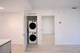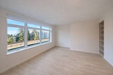 Modern and bright 1-bedroom concrete condo located at 3264 Vanness Avenue in the highly sought-after Joyce–Collingwood neighbourhood, just steps from Joyce–Collingwood SkyTrain Station (Expo Line). This well-designed home offers 532 sq ft of functional living space with a contemporary aesthetic and excellent natural light throughout. The open-concept living and dining area features wide-plank laminate flooring and large windows, creating a bright and inviting atmosphere. The modern kitchen is thoughtfully designed with full-height cabinetry, quartz countertops, integrated stainless steel appliances, a gas cooktop, built-in oven and microwave, and sleek finishes ideal for everyday living and entertaining. The bedroom is comfortably sized with sliding closet doors and neutral finishes. A standout feature of the unit is the enclosed solarium/flex space, perfect for a home office, reading nook, or additional storage. The stylish bathroom includes a large vanity with ample storage, a backlit mirror, and a glass-enclosed walk-in shower with contemporary tilework. In-suite washer and dryer are included for added convenience. The concrete building offers secure entry, elevator access, and professional management. The rental includes one secure underground parking stall and one