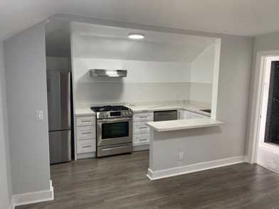 -- Fully remodeled and modern kitchen with new quartz countertops, cabinetry, and stainless-steel appliances, including a spacious refrigerator, gas range, and dishwasher.