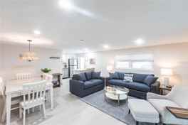 Modern kitchen with quartz countertops, brand-new stainless steel appliances, and a fully stocked inventory for all your cooking needs. Enjoy your morning brew with the Braun dual-function coffee maker (drip + K-cup compatible).