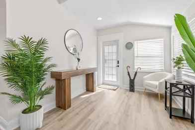 Beautifully remodeled 3-bedroom, 2-bath home located in sought-after South Tampa, just minutes from MacDill AFB. This inviting residence features an open floor plan with wood flooring throughout, ceramic tile in the bathrooms, abundant natural light, and a fully fenced yard offering added privacy. Enter the spacious living area highlighted by a stylish wood accent wall and a 55" TV that is included. The living space flows seamlessly into the dining area, and the large kitchen. The kitchen is well appointed with wood cabinetry, granite countertops, stainless steel appliances, and ample cabinet and counter space. A convenient laundry closet includes a stacked full-size front-loading washer and dryer and provides access to the backyard. The home offers two comfortable guest bedrooms. On off the dining area with a barn door and the other off the kitchen. And a guest bathroom with stone countertops and a tub. The primary bedroom features its own ensuite bathroom complete with granite countertops, double sinks, and a tub. Enjoy outdoor living in the large, private fenced backyard featuring a fire pit, two paved patio areas perfect for entertaining, and a storage shed. Prime South Tampa location with easy access to MacDill AFB, Selmon Expressway, schools, shopping, dining,