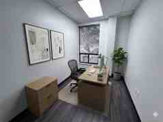 Newly renovated office suite includes 3 private rooms – 2 standard sized office spaces with a window and one large room perfect for a conference room, work room or large executive office. The 642 square foot space includes new paint, wood look flooring and new lighting fixtures.