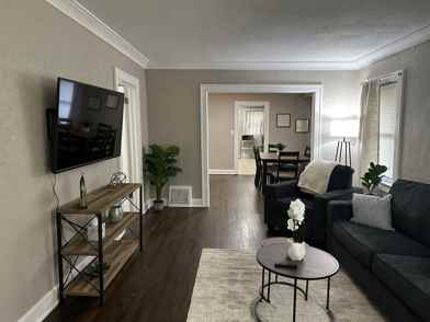 The home features a comfortable living room, a functional kitchen, a dedicated dining room large enough for a full-size dining table, and a welcoming entry area. There is also ample space to set up a home office or desk, making it ideal for remote work or study.