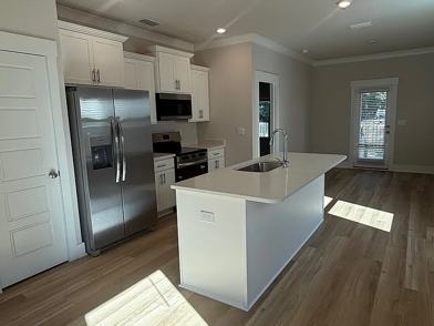 The spacious kitchen features sleek quartz countertops, contemporary cabinetry, and stainless-steel appliances perfect for everyday living and entertaining alike. The living and dining areas flow seamlessly, creating a warm and inviting space.