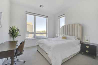 Enjoy modern, low-maintenance living in this corner-unit, single-story condominium offering two bedrooms, two bathrooms, and 1,158 square feet of thoughtfully designed living space. Ten-foot ceilings and an open-concept layout create a bright, comfortable, and functional environment ideal for everyday living. The chefs kitchen features contemporary cabinetry, soft-close drawers and cabinets, a breakfast bar, and generous storage. The spacious primary suite offers a walk-in closet, dual-sink vanity, walk-in shower, and an enclosed water closet. Both bedrooms are equipped with custom California Closet organizers. Located in a secure, elevator-served building with only 28 residences, the home includes two assigned parking spaces in a gated underground garage with an EV charging outlet, as well as a dedicated storage unit. The residence is offered fully furnished for added convenience Ideally situated near Warm Springs BART and Highways 680 and 880, with access to resort-style community amenities and the Metro Crossing clubhouse.