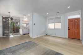 Highly upgraded 3-bedroom, 2.5-bath detached townhome located in the sought-after Los Abanicos community of Rancho Santa Margarita. From the moment you enter, the home feels light, bright, and welcoming. The spacious living room features a striking floor-to-ceiling shiplap accent wall—perfect for both everyday living and entertaining. The kitchen opens seamlessly to the dining area and has been thoughtfully upgraded with modern quartz countertops, real marble subway backsplash, updated cabinet doors and hardware, and stainless steel appliances. A deep under-mount sink with a matte black high-arc pull-down faucet adds both style and functionality. Upstairs, the primary bathroom has been fully remodeled and includes a sliding barn-style door, frameless glass shower with curb-less entry, rain shower head, and a double walnut vanity. Additional upgrades throughout the home include modern shaker-style interior doors, new baseboards and window trim, luxury vinyl plank flooring with real wood stair treads, woven window shades, and updated modern light fixtures in all bedrooms and the dining area. Enjoy one of the largest yards in the community, professionally landscaped with artificial turf, a newly painted privacy fence, and a custom side gate—ideal for relaxing or entertaining outdoors. Los Abanicos offers one of the best HOA Amenities in Rancho Santa Margarita, with access to a clubhouse, swimming pool, and tennis courts. This is a rare opportunity to live in a beautifully upgraded, move-in-ready home in a prime location.