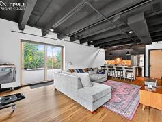 Discover urban living at its finest in this stunning studio loft/condo located in the heart of downtown Colorado Springs. Situated on the second floor within a gated community, this thoughtfully designed residence offers stylish comfort with rich hardwood floors throughout and an efficient layout ideal for modern living. The high-ceilinged living room is filled with natural light and offers direct walk-out access to an expansive covered deck, ideal space for entertaining guests or enjoying a fine summer evening. The kitchen is equipped with a center island breakfast bar, a gas range, and a pantry for additional storage, making meal prep and hosting both easy and enjoyable. The spacious private bedroom area includes an 8.8 x 4.10 walk-in closet and a well-appointed 3/4 en-suite bathroom featuring a luxurious spa shower for ultimate relaxation. Other features include a laundry room and dedicated covered parking.