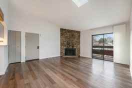 Inside, you'll find stainless steel appliances, vaulted ceilings, in-unit laundry, a private balcony, and a large primary suite with an en-suite bathroom and walk-in closet. Comfort features include air conditioning, fireplace (decorative only - cannot be used), climate control, and modern wood flooring throughout the main living area and carpet in the bedrooms.