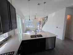 The open-concept main level showcases a sleek, contemporary kitchen with quartz countertops, custom cabinetry, stainless steel appliances, and a large center island—perfect for everyday living and entertaining. Floor-to-ceiling windows and clean modern lines fill the space with natural light, creating a bright and inviting atmosphere.