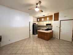 The unit features an open layout with a large kitchen that has bar seating and stainless steel appliances.