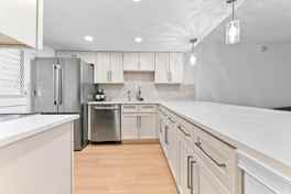 Experience the perfect blend of modern comfort and coastal serenity in this beautiful second-floor residence. The home welcomes you with cool handsome wood-look tile creating a bright and airy atmosphere. The heart of the condo is the kitchen, featuring crisp white cabinetry, stainless steel appliances, and sleek quartz countertops that offer both style and durability. This culinary space opens seamlessly to the dining and living areas, where sliding glass doors lead out to a private screened balcony--your personal haven for enjoying peaceful views of the community.
