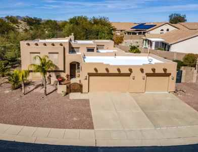 **Available for rent February 15th** Rare Oro Valley gem on one of the largest lots in Catalina Shadows Estates. This 4 bed 3 bath, 2,515 sq ft Santa Fe-style split-level home has a full guest suite, sparkling Pebble-Tec pool & 3-car garage. The 315 sq ft 3rd garage bay is heated & cooled & could be a workshop or exercise space. Tucked on a quiet, non-through street, it backs to natural desert with incredible views. Guest quarters feature their own bedroom, bath, living space and full kitchen. Durable flagstone-look tile throughout the main living areas. The main kitchen offers a breakfast bar, granite countertops, pantry storage & French door opening to one of three patio spaces. Off the kitchen is a casual dining area. The living room has soaring ceilings, gas fireplace & access to the backyard. The primary suite is secluded upstairs with its own balcony, a decorative beehive fireplace and updated bath. The backyard is built for relaxed living with a ramada-style BBQ area, artificial turf, low-care landscaping and full perimeter fencing including snake resistant fencing. Front, rear, and side patios give you room to enjoy the outdoors. Custom security front door. Minutes to Catalina State Park, Vistoso Trails Nature Preserve, multiple golf courses, shopping, dining, and every other modern convenience. This home is move-in ready! Annual leases only. Small pets allowed ($250/pet one-time fee). First month's rent, last month's rent, and security deposit (equivalent to 1 months' rent) required to move-in. Call or text Michael from Leizer Property Management to arrange your showing at 239-288-9562.