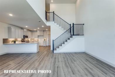 This energy-efficient home blends modern style with comfort, highlighted by a gourmet kitchen with an oversized quartz island, custom shaker cabinets with under-cabinet lighting, stainless gas appliances vented to the exterior, and a spacious walk-in pantry. The first floor features beautiful vinyl plank flooring, while the second-floor living area showcases open railings overlooking the dramatic two-story living room.