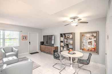 Beautifully redone garden level 1 bedroom 1.5 bathroom apartment in East Boca Raton. Live in or own and lease with fantastic rental income. Recent total renovations include tile floors, both bathrooms and kitchen with all new appliances.